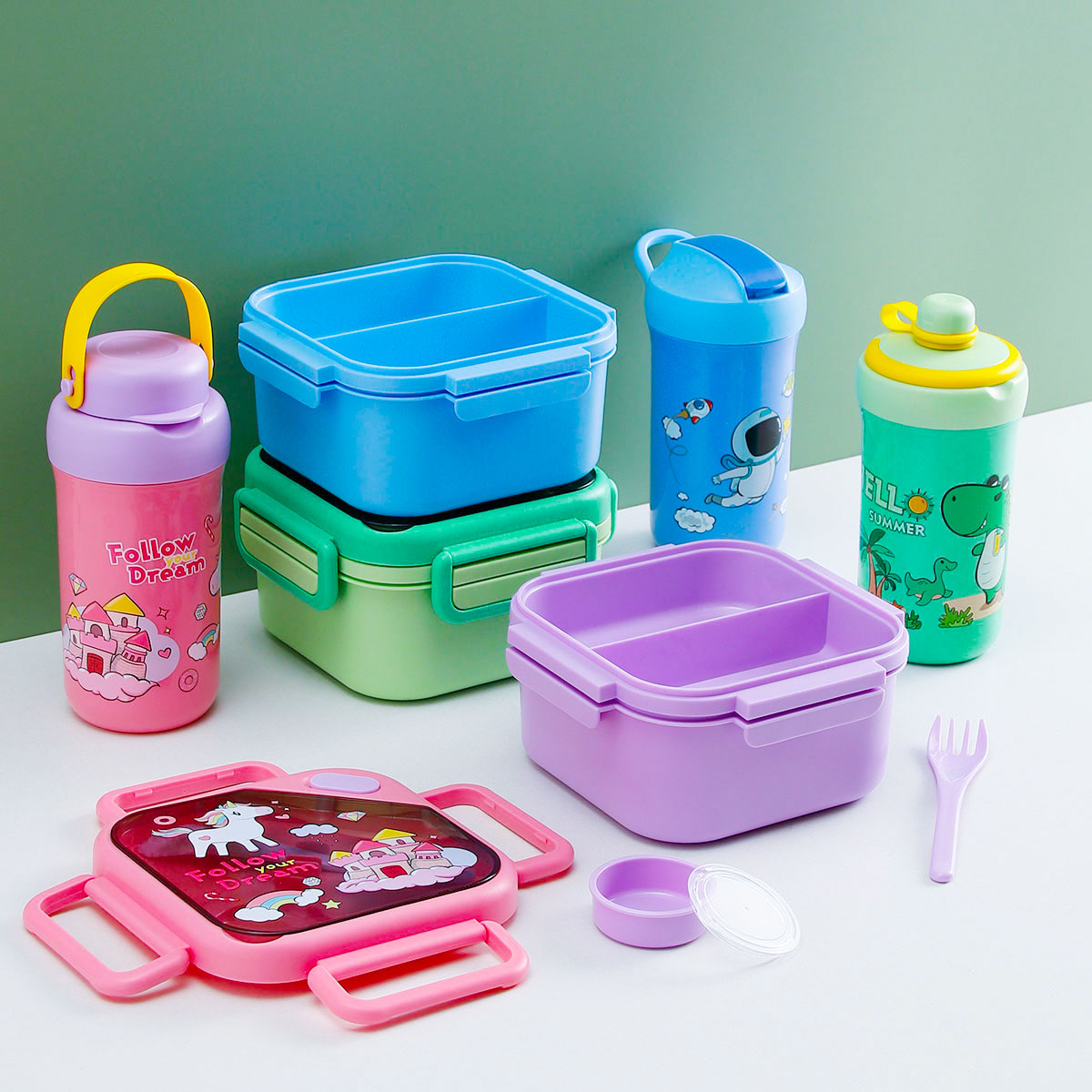趣悅卡通正方雙層飯盒(含調料盒)+翻蓋吸嘴/旋蓋運動/翻蓋運動水壺