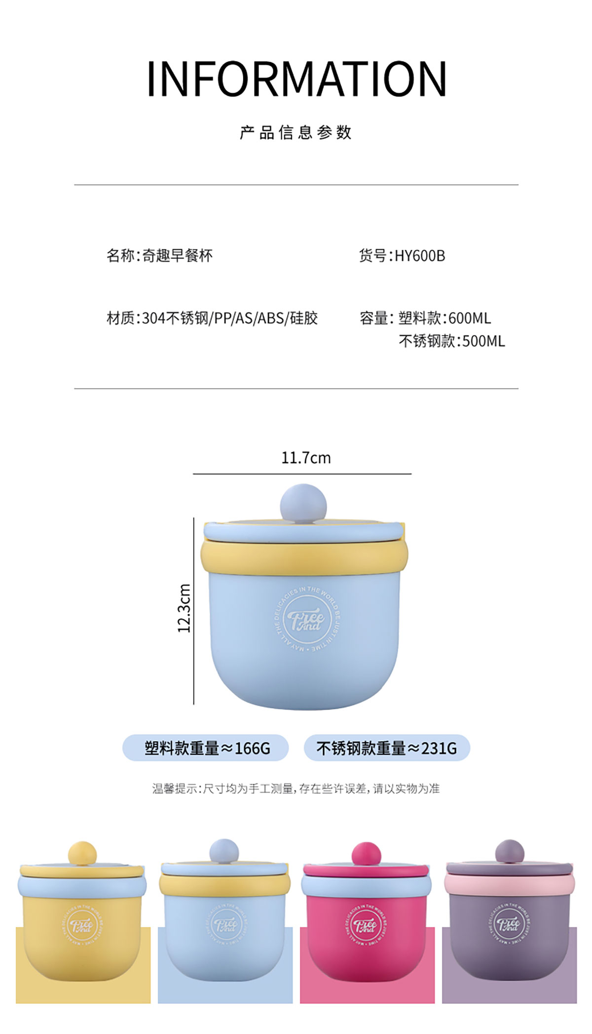 不銹鋼款:直徑117*123mm/500ml